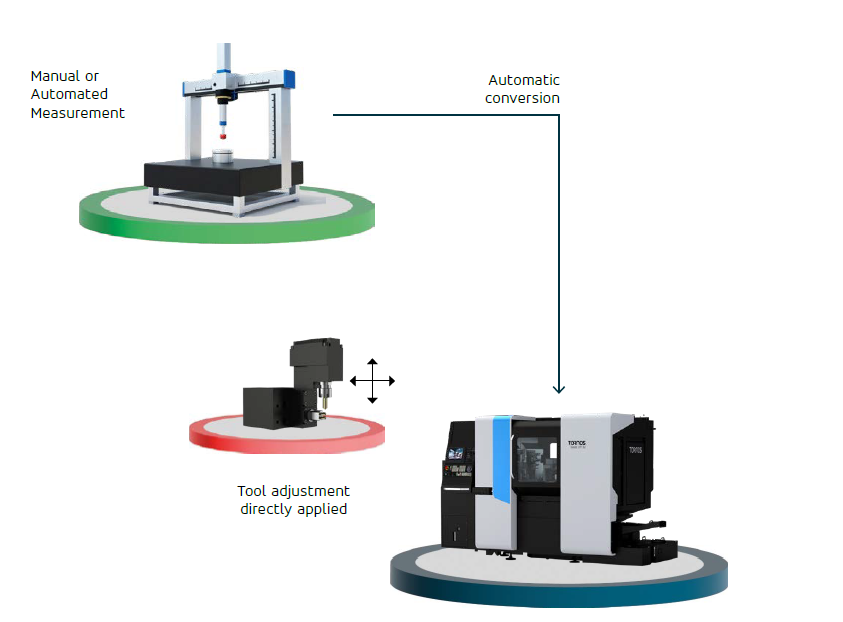 Le Closed-Loop Manufacturing connecte automatiquement les systèmes de mesure à vos machines-outils. Les mesures sont converties en corrections d’outils et appliquées instantanément — sans intervention manuelle.